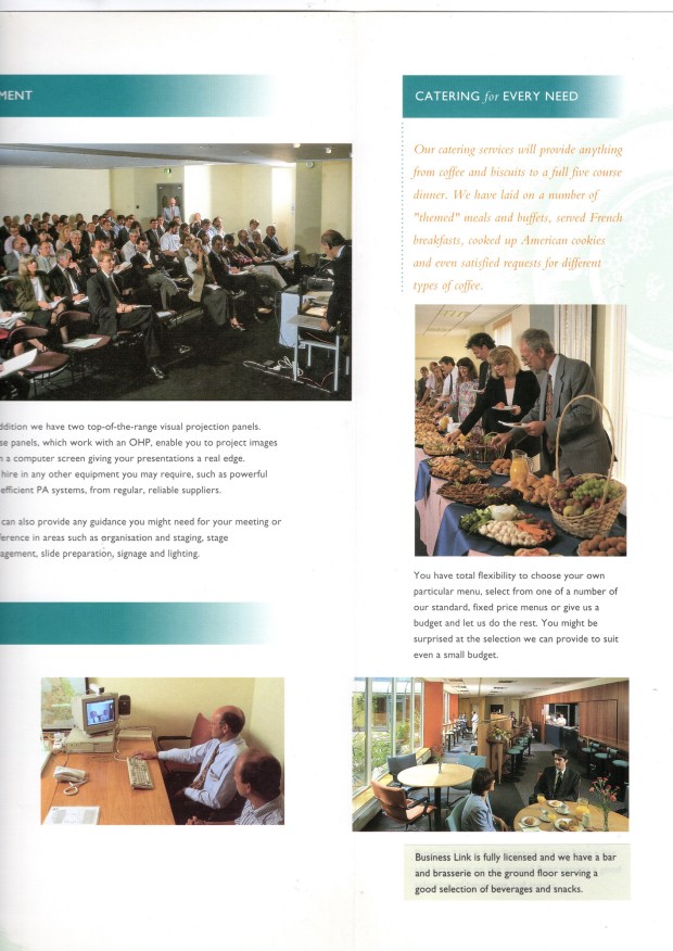 Finally, catering on a rather smaller scale than the Royal Pavilion . . . I had photographed case studies for Business Link Hertfordshire, so I was familiar with the location when they needed shots for a brochure illustrating the venue. I hope you’re amused by the sticker under the lower ‘catering’ photograph. It covers the original caption, which talked about the ‘brassiere’ on the ground floor. Time heals most things . . .