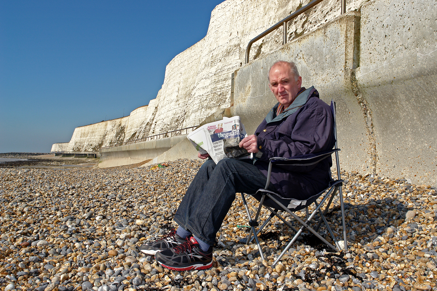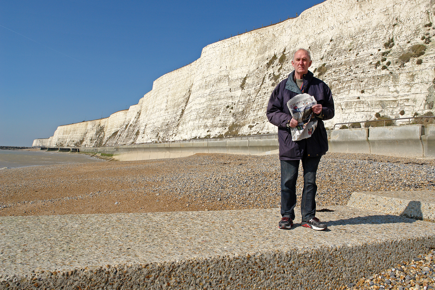 A few years ago I photographed a delightful man called Tim Andrews. Tim has undertaken a huge project over the past decade, getting himself pictured by literally hundreds of photographers. ( I was no. 384 ) This is because Tim has suffered from Parkinson’s Disease, and (it seems to me) that he’s keen to leave some trace of his life – transient as all lives are. I did the shots on the beach at Saltdean, under the cliffs, and I asked Tim to bring that day’s newspaper. So I had a series of nested images: That day (proving he was there, like a kidnap victim), then Tim’s own life (presumably a span of seventy or eighty years), then the concrete breakwater (which will last for centuries), all overlooked by the chalk cliffs which are millions of years old. Tim loved the image, and came up with the perfect title. – ‘Here Today’. Thanks, Tim.