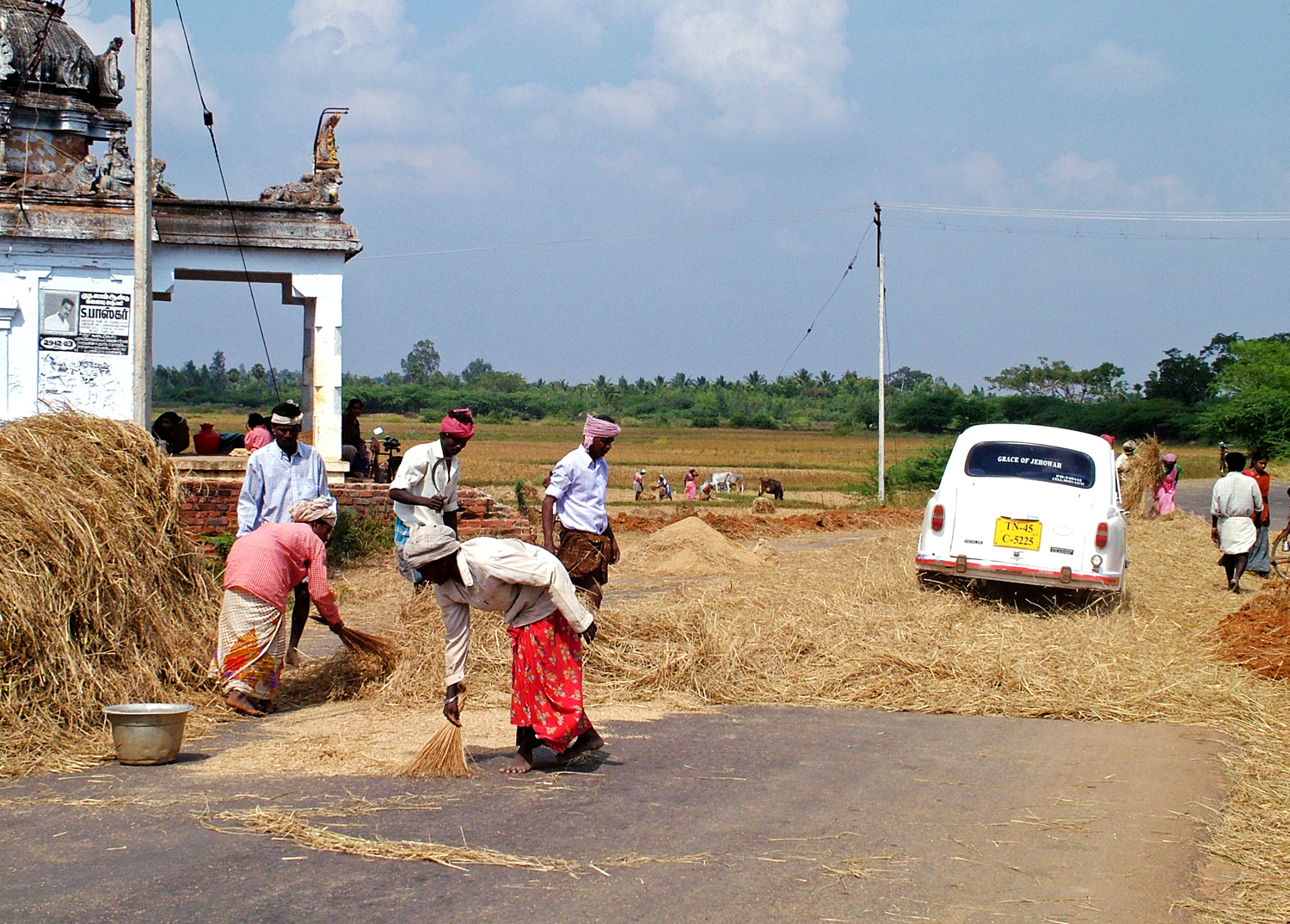 I already knew about rice paddyfields, but I’d never imagined that passing vehicles could be used for roadside threshing. But what else do you do if you’ve got no money for equipment – but are very bright and innovative?