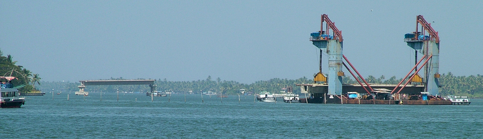 New bridge links at Kochi, but in the Backwaters much produce is carried by canoe.